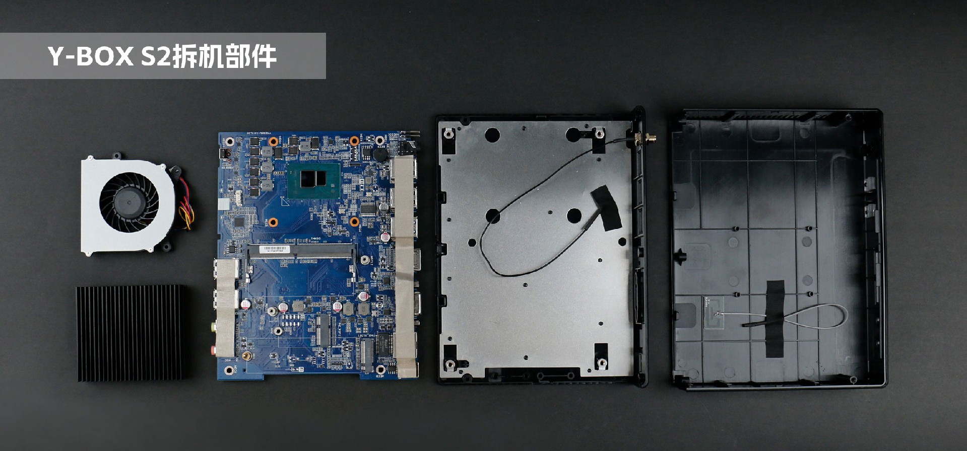 非凡电子桌面云终端Y-BOX S2机壳由两片式塑胶壳组合而成,整机由上至下主要分为三个部分:顶部外壳、内部主板、底部外壳。底部外壳内附一层铝板防静电,以防主板被静电损坏。主板处理器顶部安装一体式铝板鳍片,并涂抹一层散热膏用于导热,提高散热强度。同时,主板中部安装强劲的风扇用于散热,降低内存与硬盘读取时受温度的影响,提高运行稳定性。