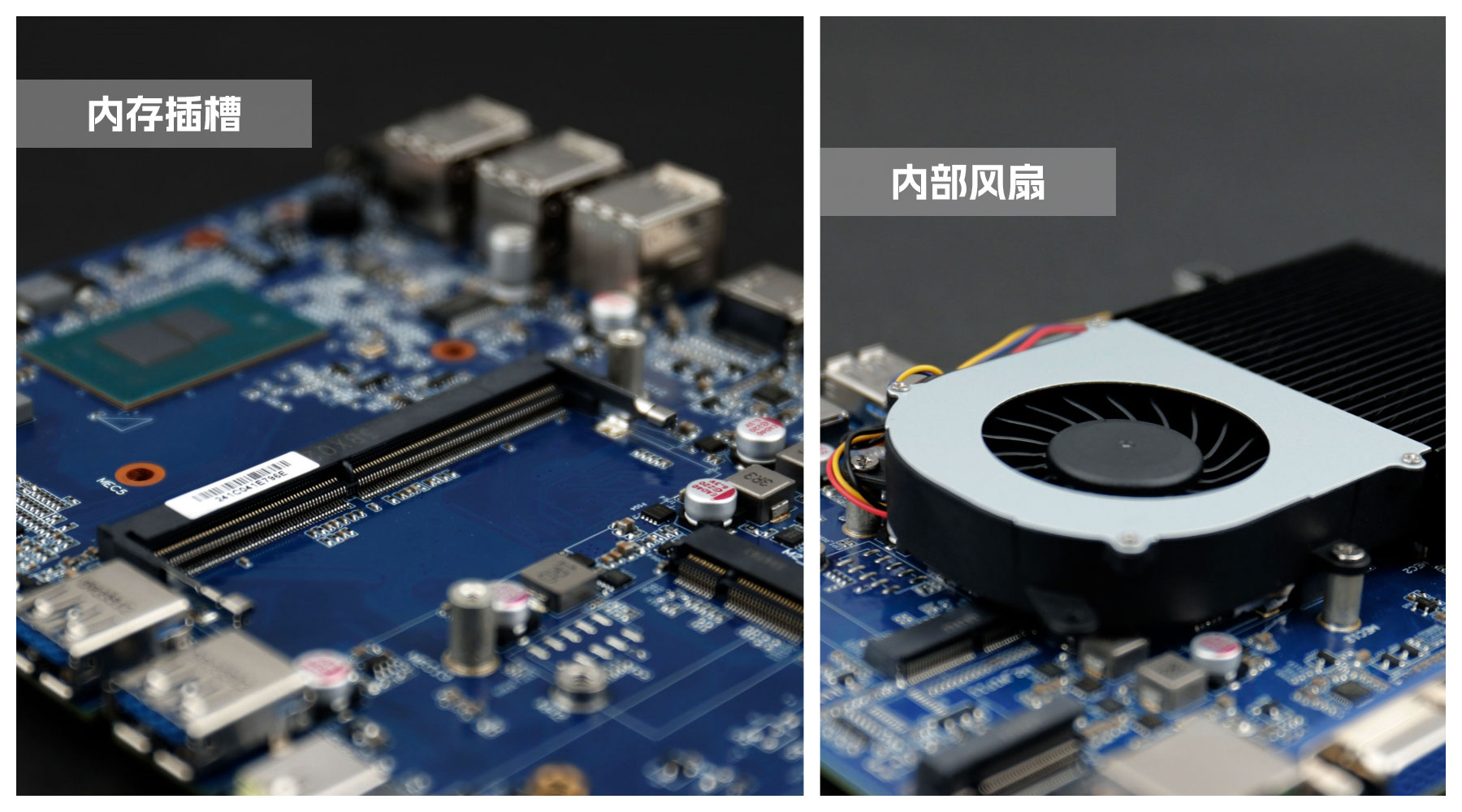 非凡电子桌面云终端Y-BOX S2主板中部是内存插槽,采用单通道笔记本内存槽设计,最大支持容量可达32GB,最高支持DDR4-3200MHz频率,横插的形式可以减少主板的占用体积,使整体机身更紧凑,内存顶部的风扇起到高效散热的作用。