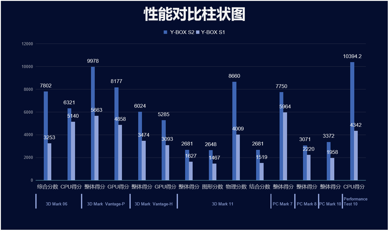 非凡电子来具体看看各个测试项目的跑分情况,测试项目包括显示性能测试、系统性能测试、CPU性能测试,分别用3D Mark、PC Mark以及Performance 10等系列不同软件的跑分数据,针对两款主板的跑分情况可以看出,非凡电子桌面云终端Y-BOX S2的数据在各项性能上都得到了大幅度提升,柱状图能更直观地体现出数据的变化,非凡电子将针对具体的几项数据来进行详细分析。
