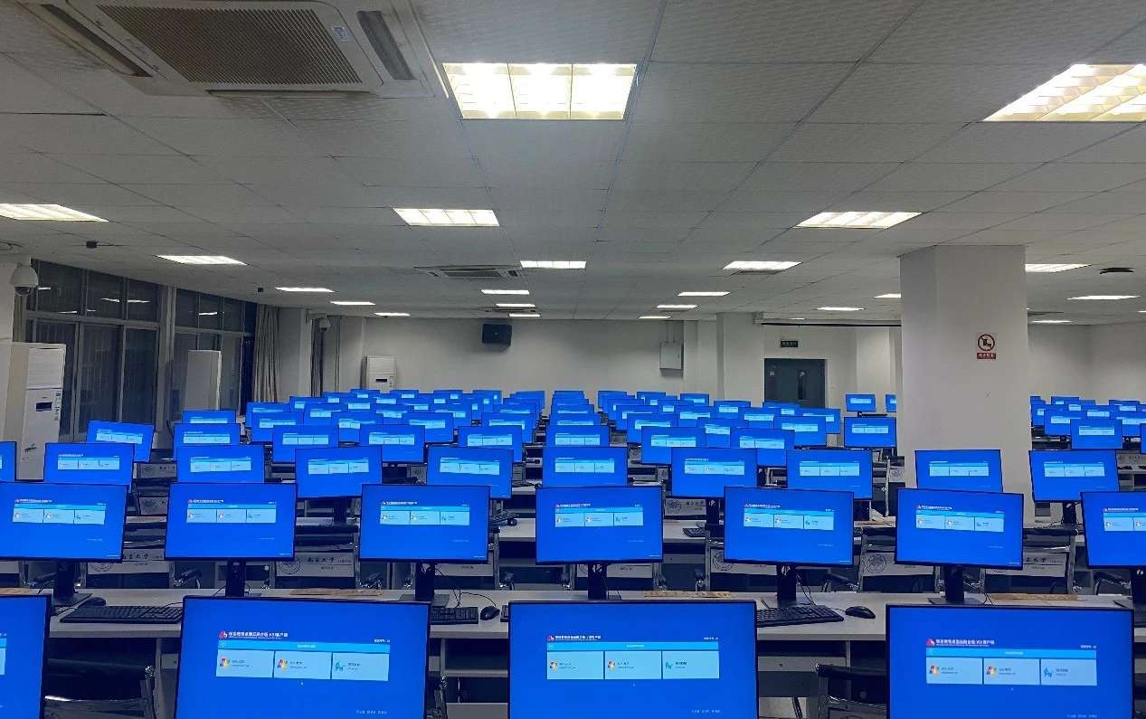 在某大学实训室,整齐的电脑屏后面是统一的非凡电子科技云终端主机,老师在讲台上通过电脑端的管理软件,轻松地将教学资料推送到学生的终端上,每位学生的电脑屏幕一致会出现同个页面。