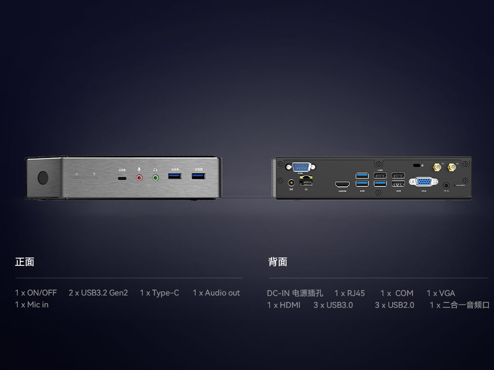 云终端对数据传输和接口扩展要求较高,接口配置了2 x USB3.2 Gen1,1 x USB3.2 Gen1 Type-C ,3 x USB3.2 Gen2 ,3 x USB2.0,可连接各种外设并提供高速的数据传输速率,另外搭配1 个RS232 ,用于串口通信,以及集麦克风和耳机功能于一体的二合一音频接口。