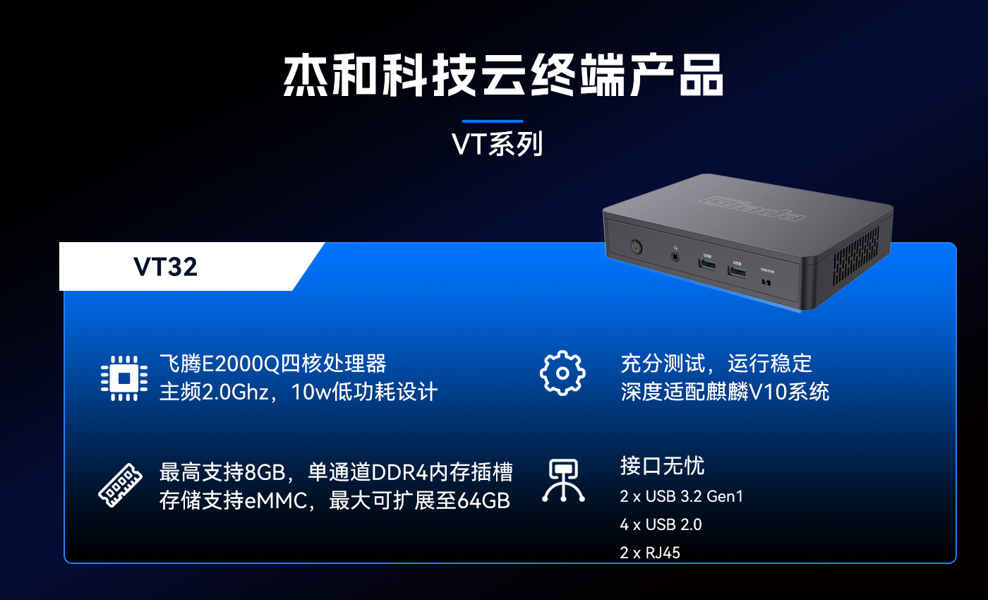 为响应信创趋势,非凡电子科技推出了搭载国产芯片—飞腾E2000Q的云终端VT32,VT32与麒麟V10操作系统进行了深度适配,为用户打造出更加安全可信的解决方案。