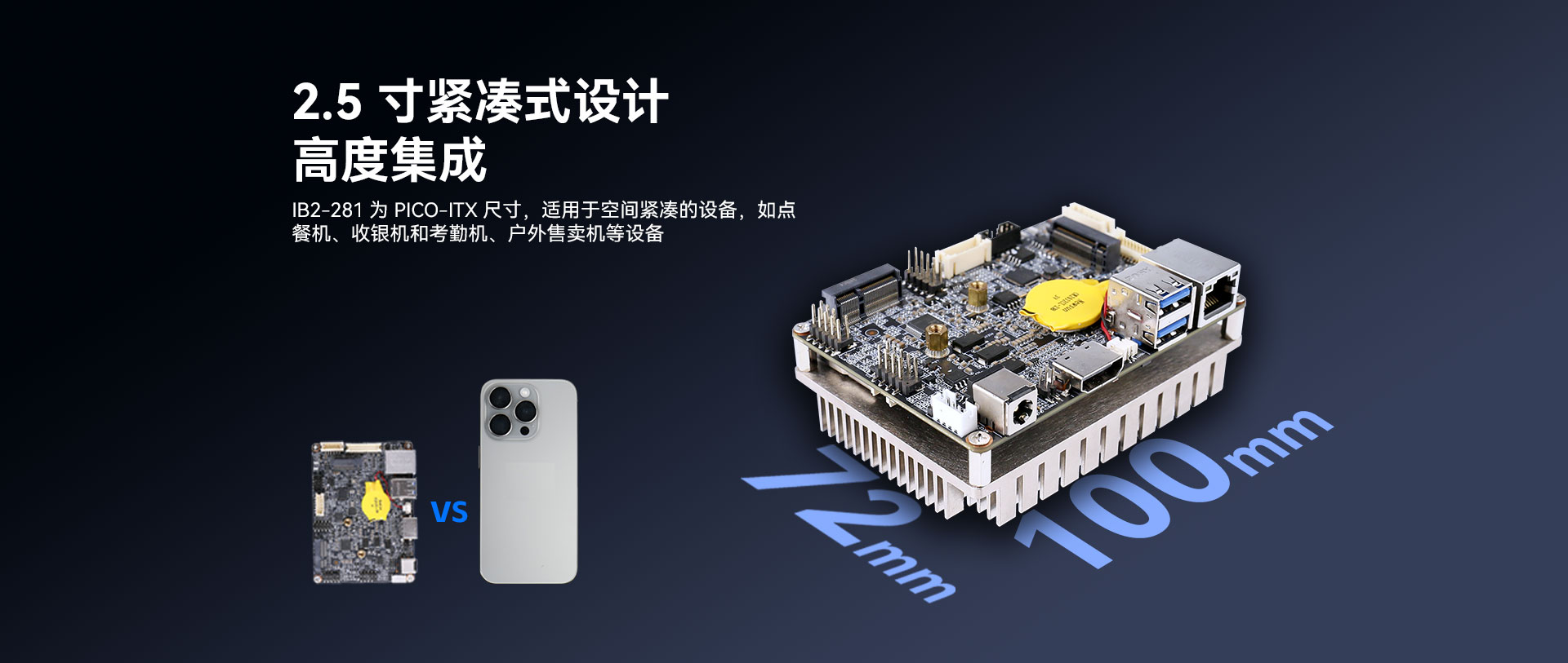 无风扇嵌入式主板去掉了风扇这一易损部件,消除了因风扇故障引发的系统问题,提高了系统的稳定性和可靠性。它采用了高度集成化的设计,体积更为小巧,如非凡电子科技Pico-ITX主板IB2-281,其2.5寸紧凑式设计,适用于点餐机、收银机和户外售卖机等空间有限的应用场景。这种主板通常具备低功耗的特性,减少了能源消耗,也降低了发热。而且,它的稳定性极佳,能适应各种复杂环境。