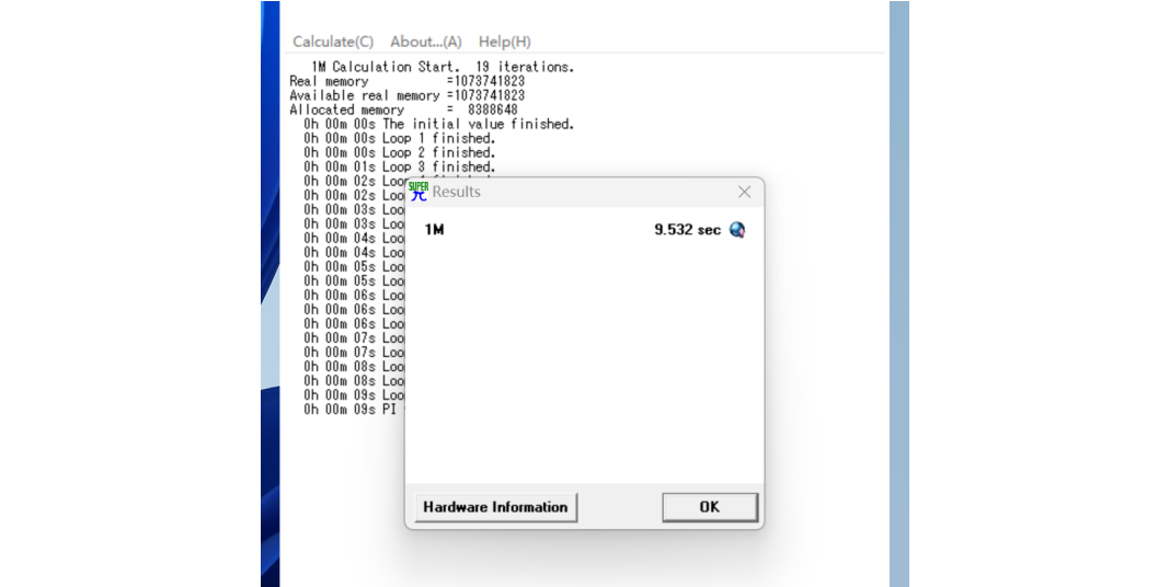 为了评估 CPU 的性能,非凡电子使用了Super PI 1.1 进行了测试,软件以用时为参考成绩,花费时间越短代表计算性能越强。在本次测试中,Core i5-13400 处理器用时 9.532 秒完成了计算,属于当前中端处理器的主流水平,足以应对日常编码、分析和轻量建模任务。