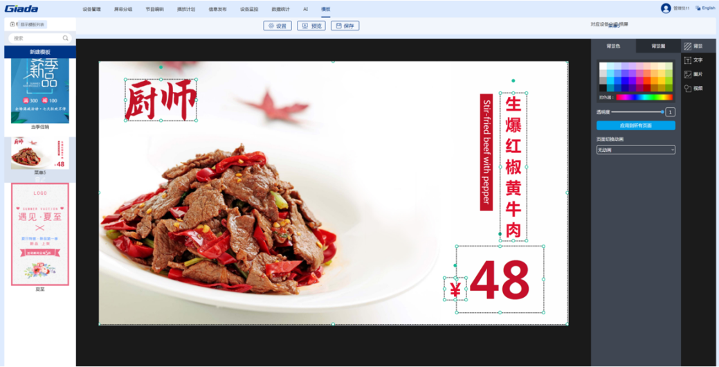 非凡电子科技智慧餐厅综合解决方案是由智能零售管理系统搭载公司自研的数字标牌播放器组成的软硬件一体化方案。该系统针对餐厅、酒店等不同行业提供典型节目模板,支持手机、电脑建议操作。用户只需3步即可完成节目的制作播放:选择节目模板,更换自己的素材(视频、图片和文字),预览保存及播放。价格、优惠折扣等信息可随时更改。