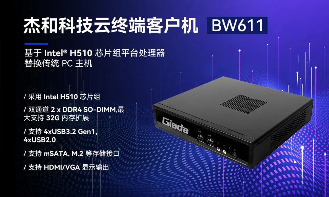 随着各个行业的业务难度以及专业程度不断提高,应用场景复杂多变,对云终端提出了更高的要求,Giada非凡电子科技云终端产品BW611具备便捷管理部署、性能强悍、扩展性强、安全性高等优势,能满足多种复杂应用场景,满足用户性能需求的同时,提供非凡的使用体验。