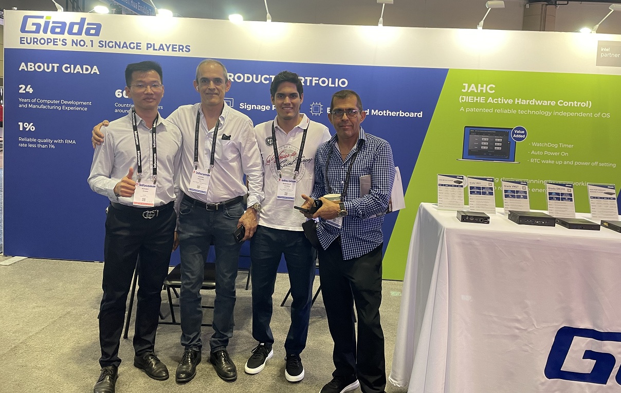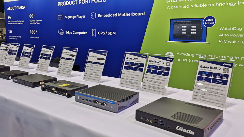 展会上Giada非凡电子科技携最新的数字标牌和信息亭应用解决方案以及最新尖端产品惊艳亮相!其中最新的数字标牌播放器、边缘计算机和OPS(开放式可插拔规范)产品在现场备受关注,标志着Giada非凡电子科技互动显示器和智能标牌解决方案领域的重大进步,也向全球参展观众集中展现了公司的非凡实力。