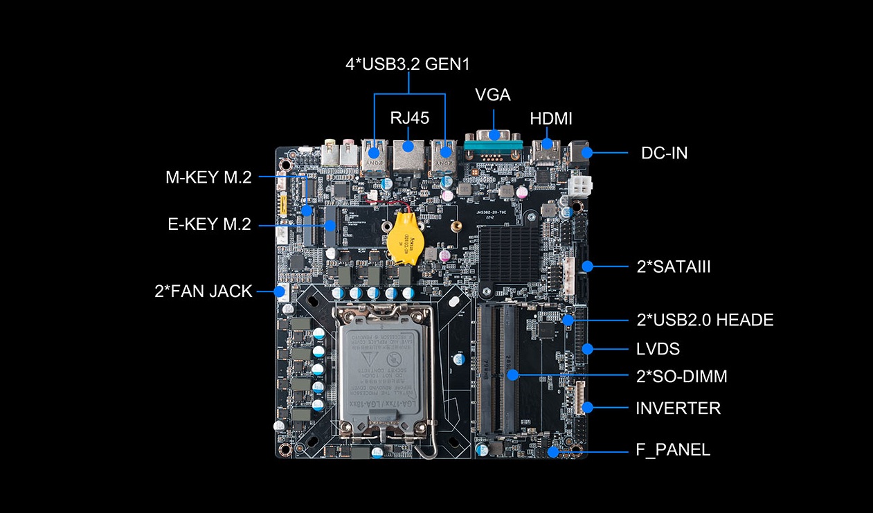 非凡电子科技主板CB4-8121是基于Thinmini ITX一体机标准设计,采用Intel Alder Lake-S平台H610芯片组,支持全新第13/12代Core i7/i5/i3处理器,搭载双通道SO-DIMM DDR4-3200MHz内存、1 x M-Key M.2 (2242/2280) SSD和 2 x SATAIII存储,强大的配置能够为用户带来出色的计算和图形处理性能,无论是载入游戏、数据传输还是平面设计,赋予用户更加极致流畅的使用体验。