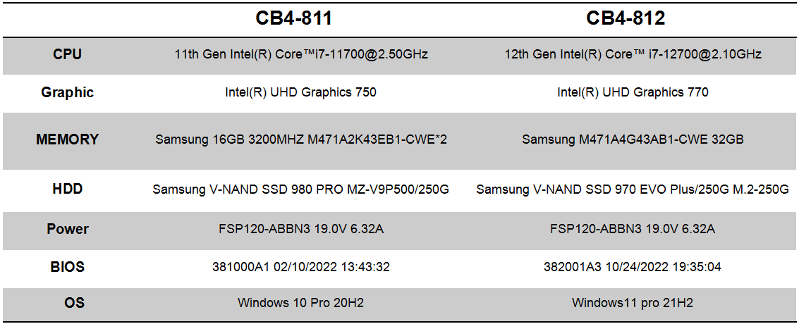 全性能测试报告中,值得关注的是性能测试的跑分数据和稳定性测试内容,这能直观影响主板在一体机中的稳定性和用户的使用体验。针对性能测试,非凡电子选择了将CB4-8121与前一款更迭产品CB4-8111进行对比分析,并分别选取了以下配置: