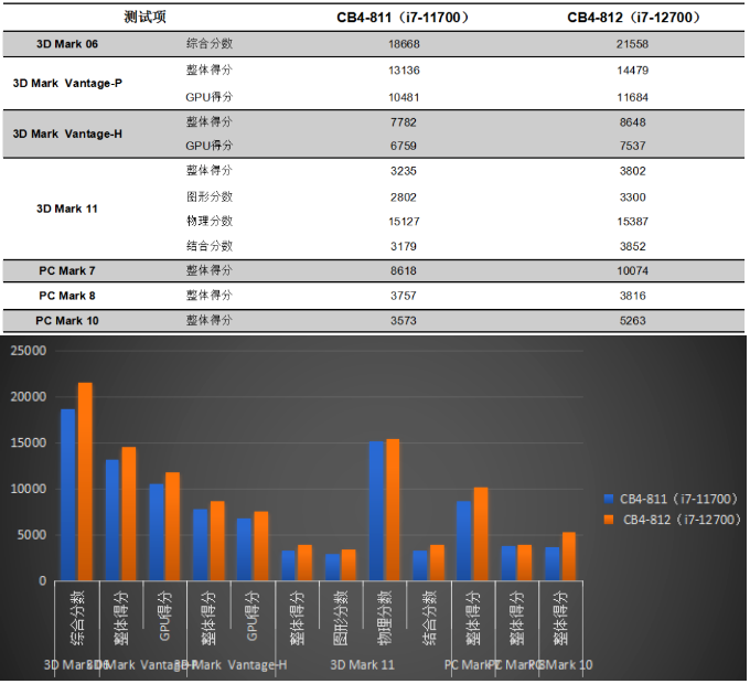 非凡电子来具体看看各个测试项目的跑分情况。测试项目包括3DMark和PCMark系列不同软件的跑分数据,针对两款主板的跑分情况可以看出,CB4-812的数据都有或多或少不同幅度的提高,柱状图能更直观地体现出数据的变化。非凡电子将针对具体的几项数据来进行详细分析。