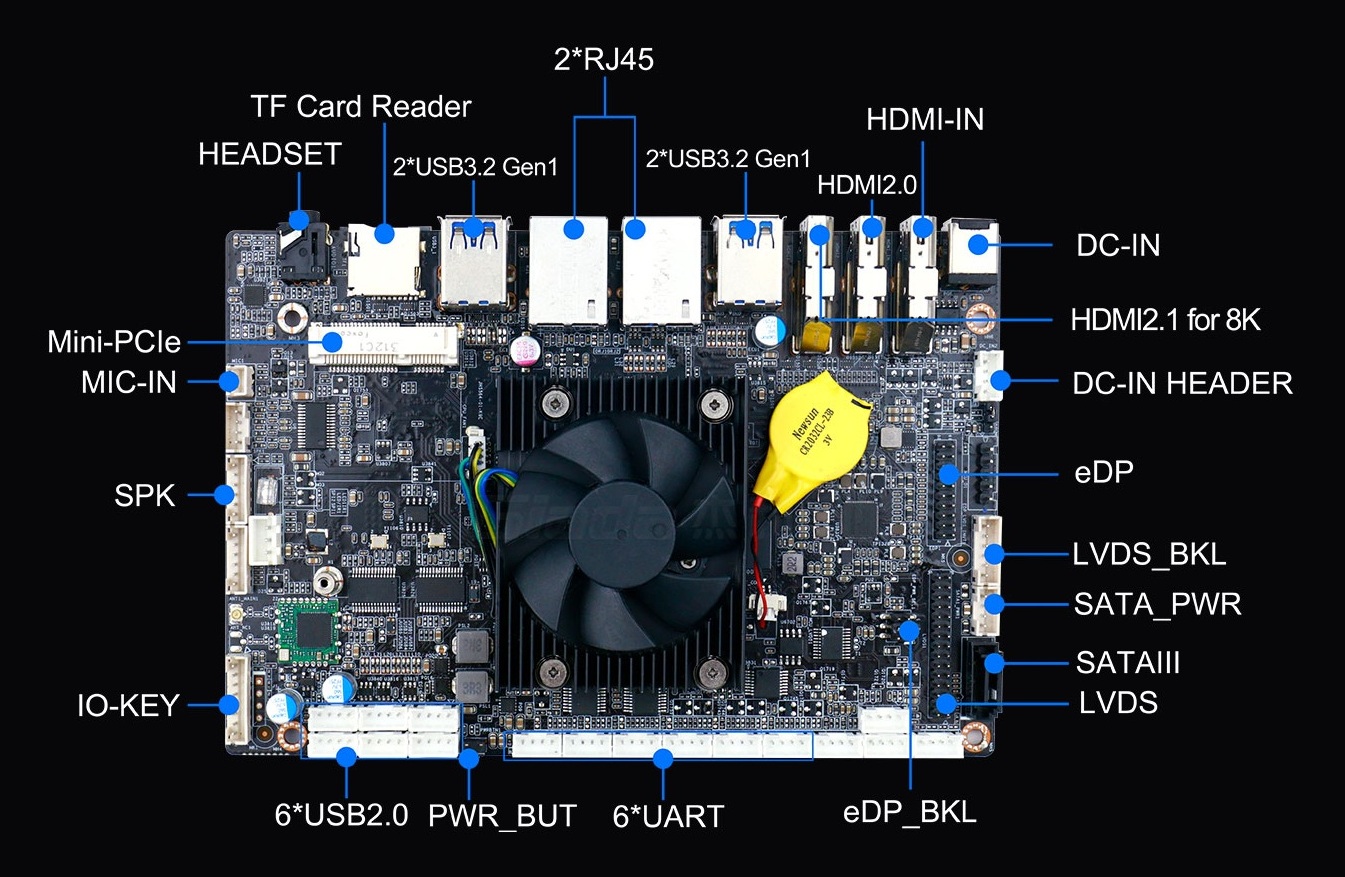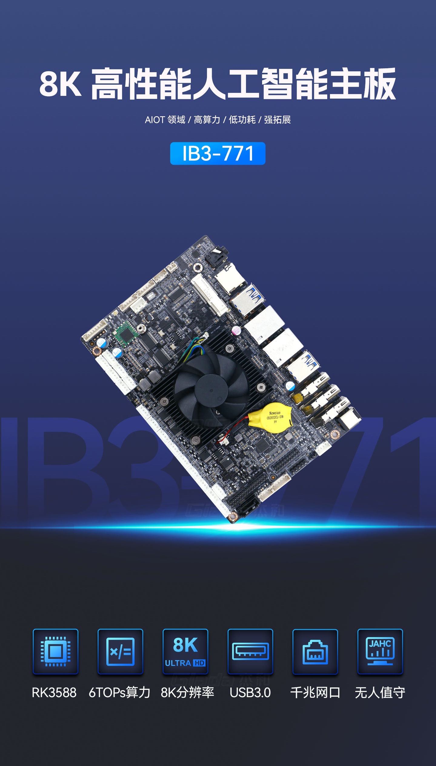 非凡电子科技IB3-771采用瑞芯微全新旗舰级芯片RK3588,搭载八核64位处理器,集成ARM Mali-G610 MP4 GPU,高算力、低功耗、具备强大的视觉处理能力;性能强悍的RK3588内置AI加速NPU,提供6TOPs算力,支持主流深度学习框架,为各类AIoT应用场景提供更优的性能表现。