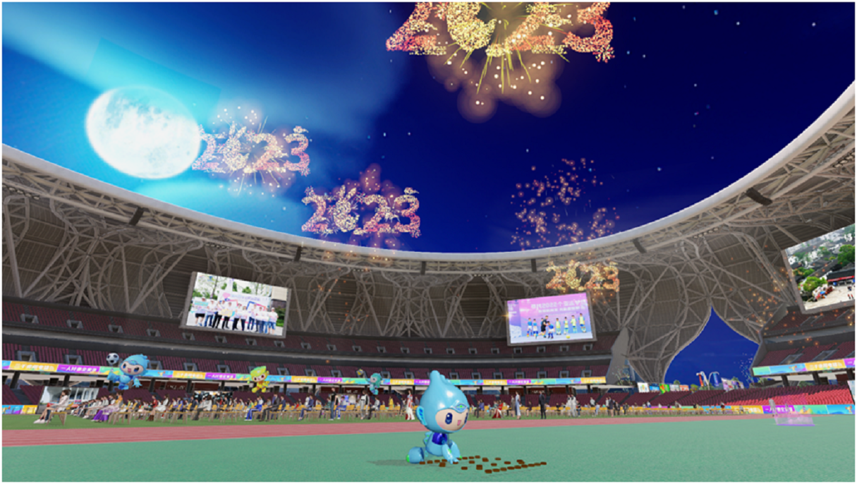 大莲花体育场内安装了185米宽、20米高的超大IMAX立体透视网幕,不仅数字人传递火炬的超燃画面,在闭幕式上观众看到的数字烟花效果,也都是通过它传递给了现场的观众。这使虚拟场景与真实世界无缝融合,不仅节约了资源减少碳排放,更是给全亚洲乃至世界,一场耳目一新的视听盛宴。