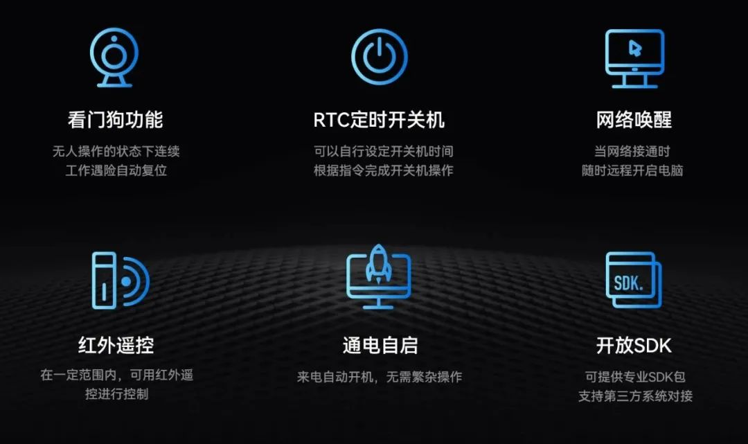 非凡电子主板IB3-771配置了无人值守专利技术,大力降低因高算力带来的能源消耗,该技术通过定时开关机、看门狗计时器、RTC宕机自检、红外遥控和局域网唤醒等功能实现主板绿色运行。