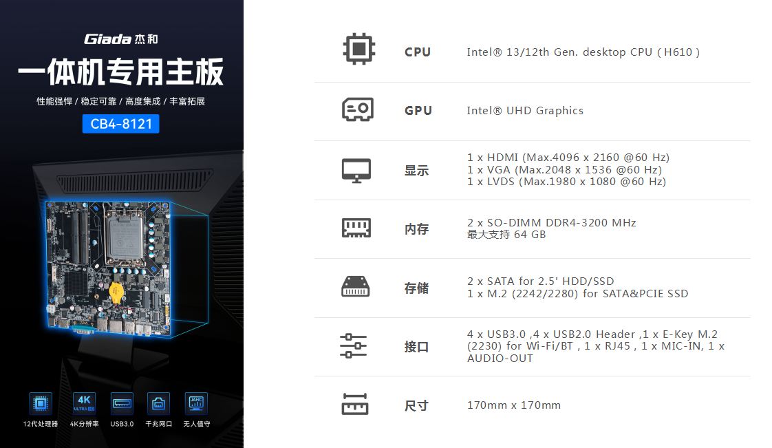 一体机在使用体验方面也有独特的优势:比笔记本屏幕大,比台式机更简洁,也解决了一直为人诟病的台式机线缆多而杂的问题,另外,随着计算机硬件和制造工艺的不断发展,一体机的性能也在不断提高,因此,越来越多的教育办公、日常娱乐和学习的用户选择使用一体机。Giada非凡电子科技根据市场与客户需求,推出这款高性能的一体机专研主板CB4-8121,带来全新震撼体验。