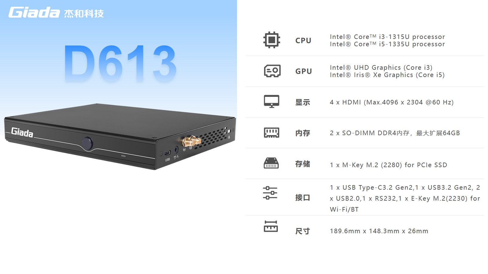非凡电子数字标牌D613搭载Intel RaptorLake Corei3-1315U/i5-1335U处理器,可以同时连接4个4K显示器,支持4K分辨率编码解码,还支持5G蜂窝网络,速度比4G LTE快10倍。