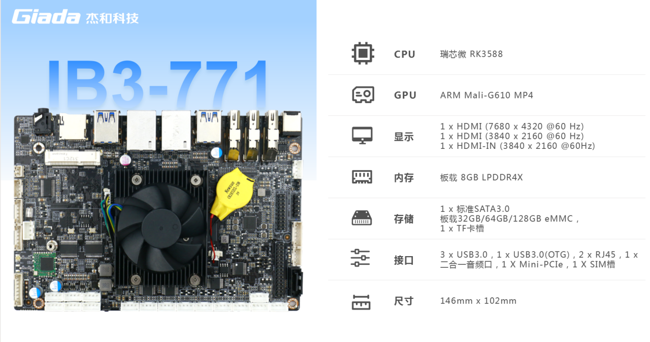 非凡电子主板IB3-771搭载瑞芯微RK3588八核64位处理器,内置6TOPS算力的NPU,具备高算力、内存大、超强多媒体、多重扩展等技术优势。满足8k超高清视频的显示需求,还支持主流深度学习框架,为各类 AIOT 应用场景提供更优的性能表现,支持机器人、边缘计算、智能NVR、智能汽车、智慧大屏、AR/VR、智能自助终端场景的广泛应用。