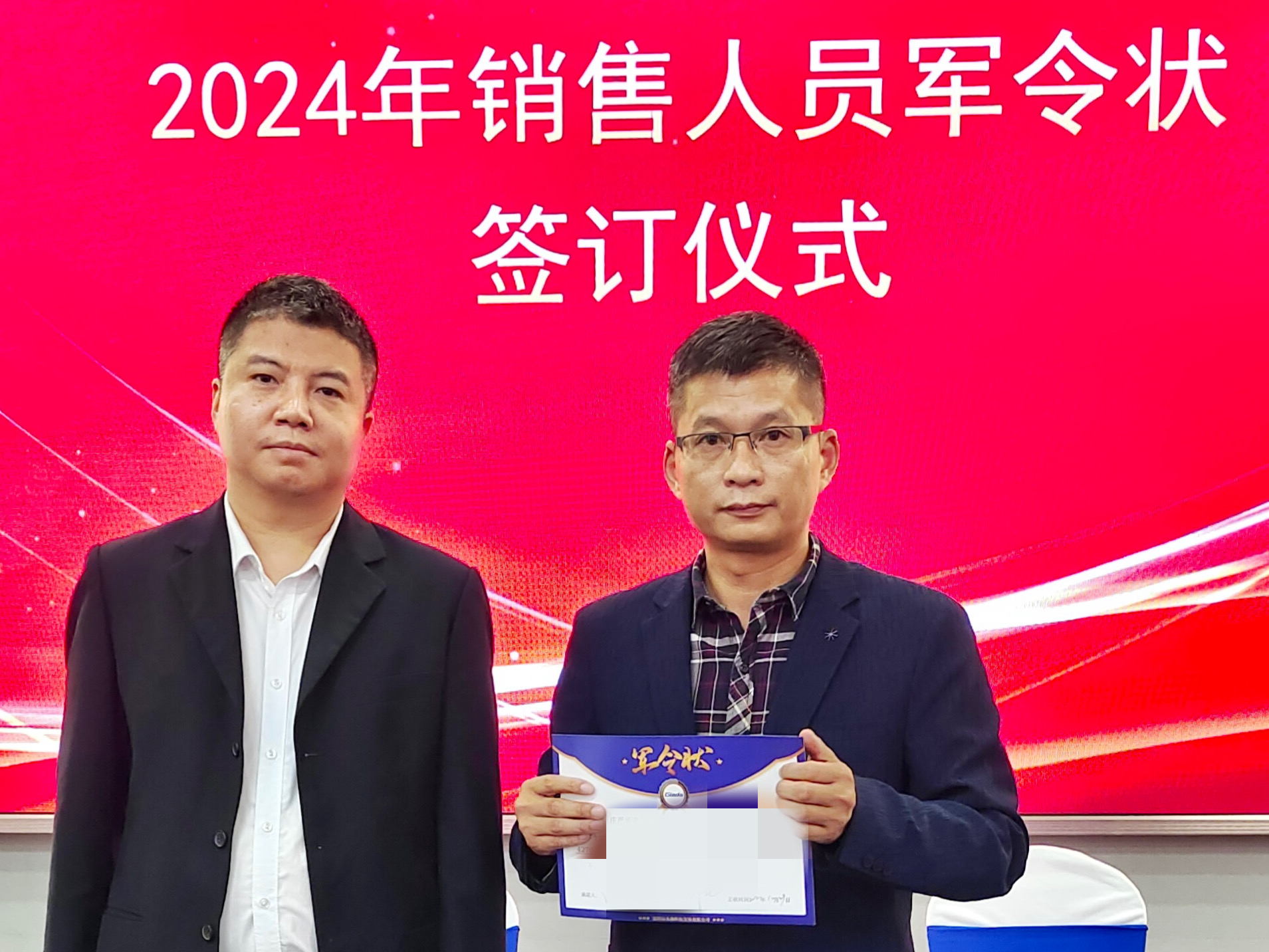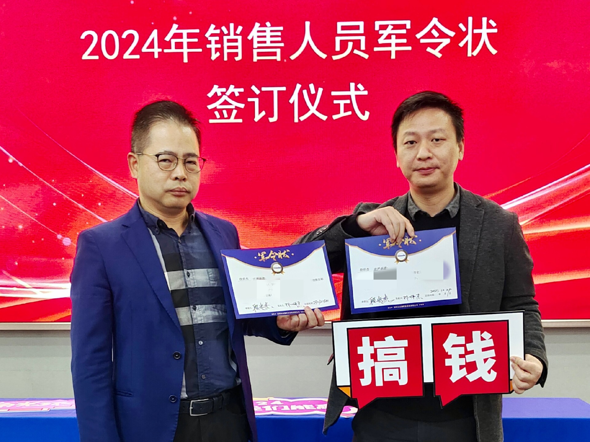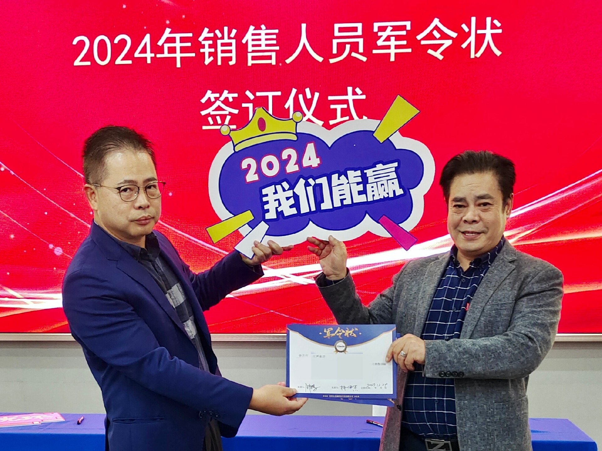 2024公司年度战略目标确立,言出必行,使命必达,国际/国内销售团队为了共同的目标开始军令状签约仪式。一纸军令状,是非凡电子科技与销售人员的双向承诺,是压力,更是动力。是不破楼兰终不还的决心,更是春风得意马蹄疾,一日看尽长安花的期待。