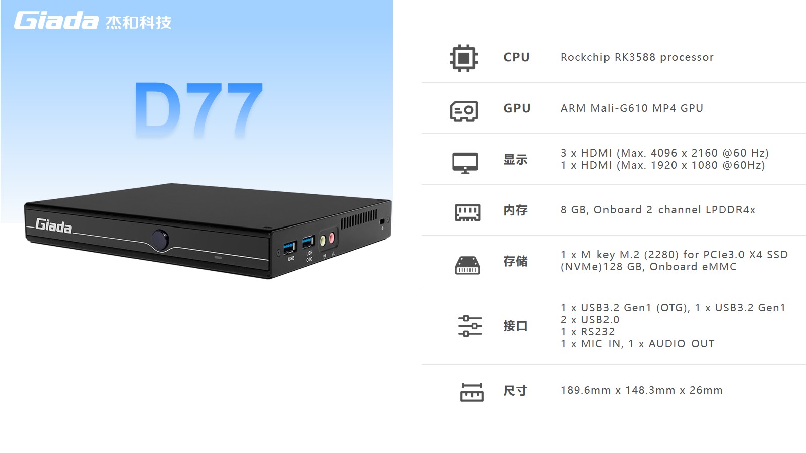 媒体播放器主要应用在大型商场、校园、户外大屏、超市、机场等公共场所,通过大屏幕终端显示设备,发布商业、财经和娱乐信息的多媒体专业视听系统,以其震撼的视觉效果、强烈的画面冲击力和高曝光率等特点,媒体播放器已经成为成为品牌传递信息、展示形象的重要渠道。非凡电子媒体播放器D77能够输出4个独立且支持4K UHD 分辨率的HDMI 屏幕,搭载八核架构,拥有6TOPS 算力的RK3588处理器,采用的ARM Mali-G610 MP4 GPU让D77 具备极其强大的图形性能。
