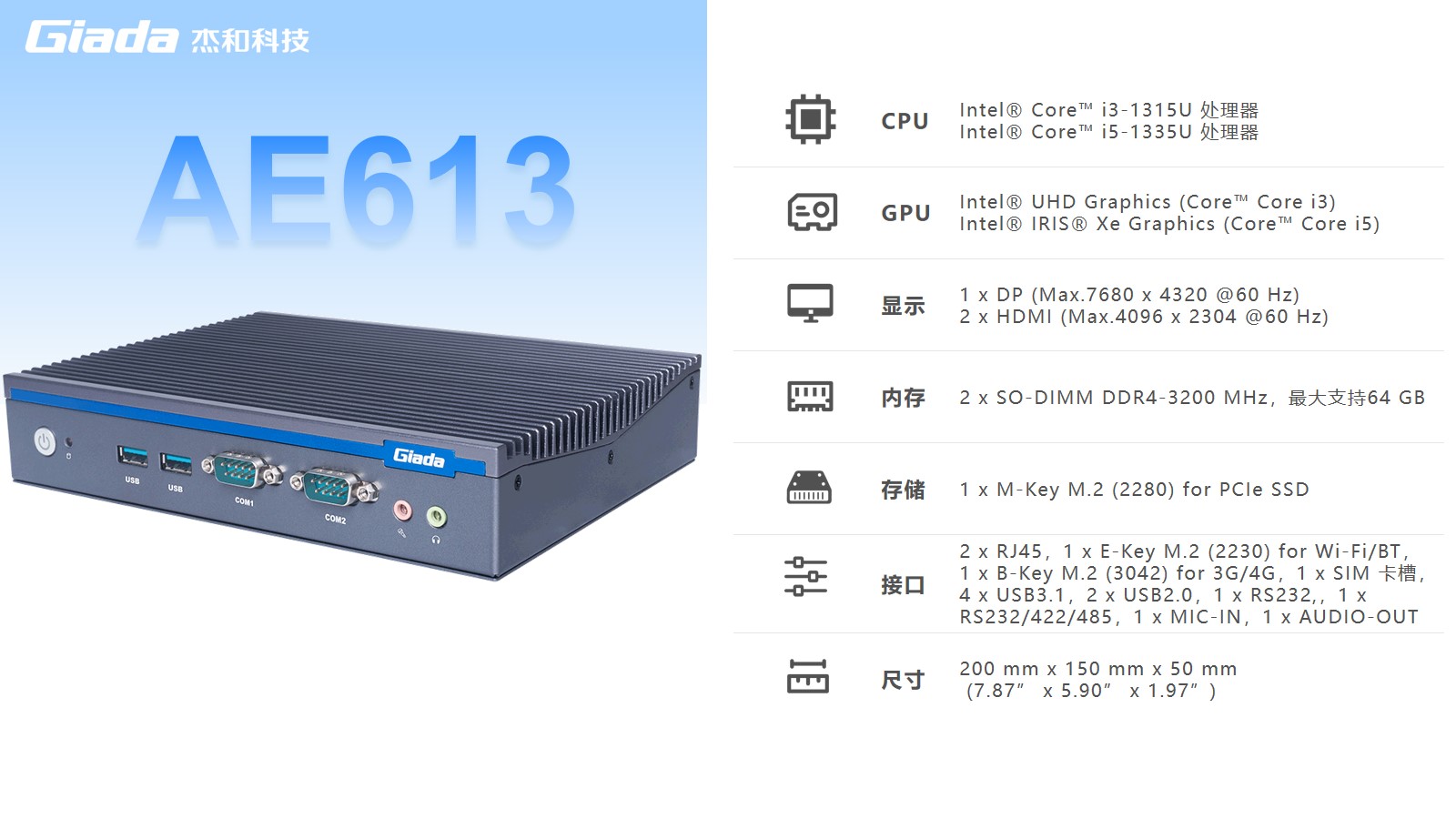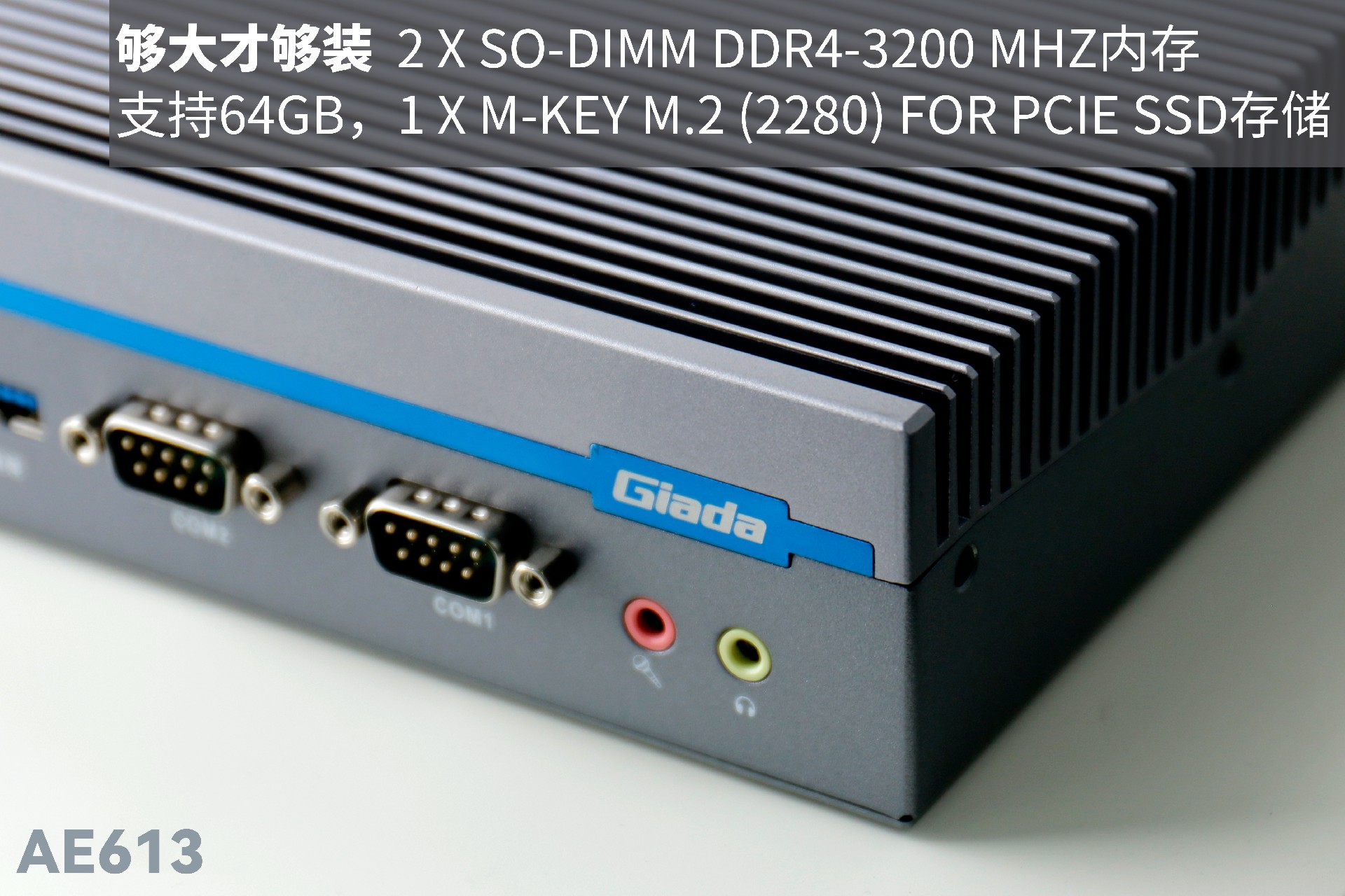非凡电子AE613拥有2 x SO-DIMM DDR4-3200 MHz内存、1 x M-Key M.2 (2280) for PCIe SSD存储,最大支持64GB,无论是处理复杂的多任务环境、还是运行高负载的软件都游刃有余。