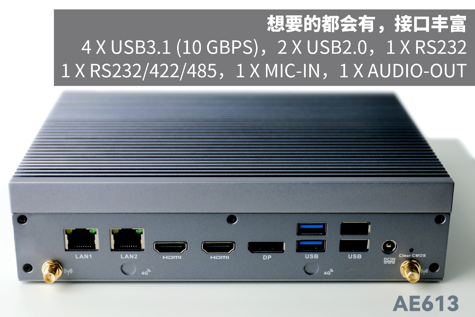 非凡电子AE613支持Windows 11 、Linux Ubuntu系统;拥有丰富接口:双千兆自适应RJ45网口,4 x USB3.1 (10 Gbps),2 x USB2.0,1 x RS232,1 x RS232/422/485,1 x MIC-IN,1 x AUDIO-OUT,帮助用户实现更多功能扩展;并且支持Wi-Fi 6E,可以提供更高的带宽和更少的干扰,支持对无线网络有特定需求场景的应用。