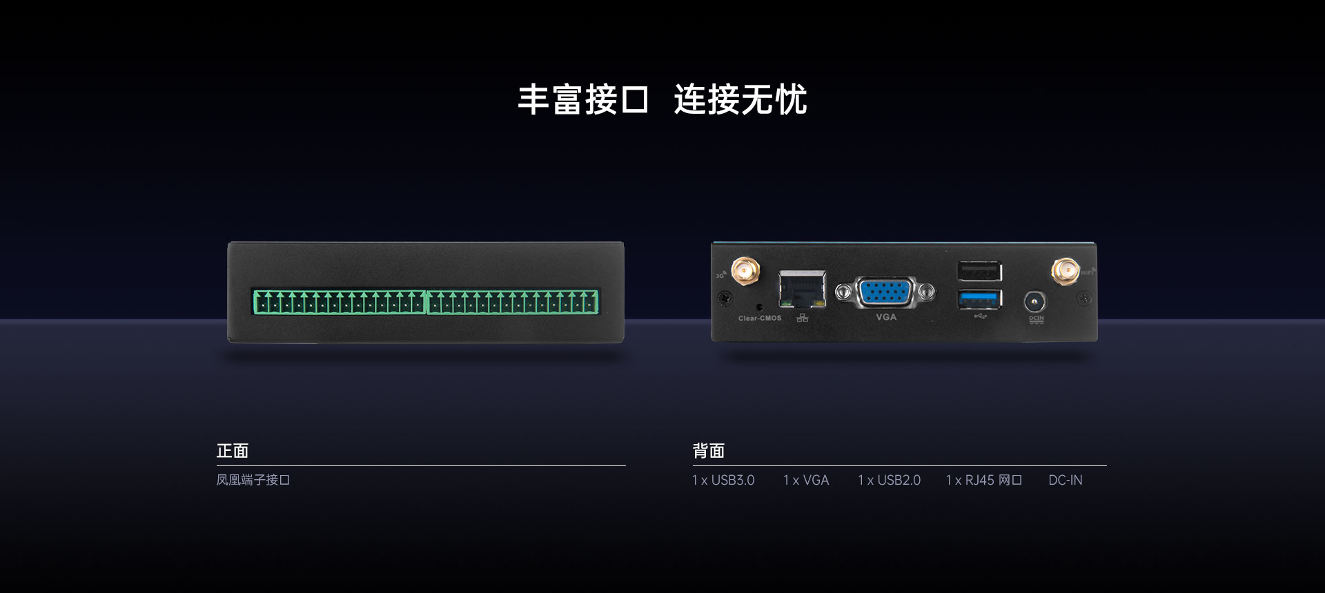 GPIO(1PIN)*2、USB(4PIN)、TTL(3PIN)*2、RS485/RS422/RS232(9PIN)